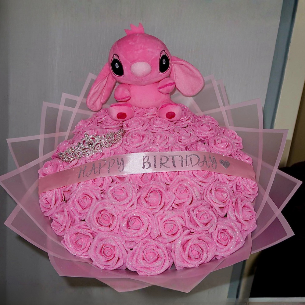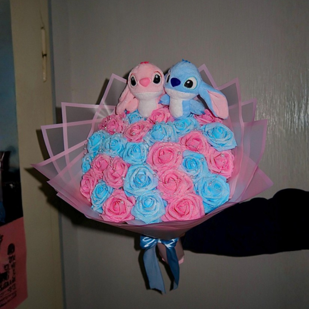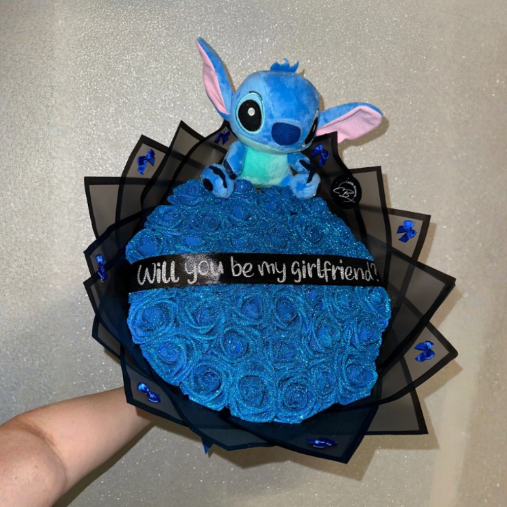 Pick the blue bouquet with cute Stitch or the pink bouquet with Hello Kitty. Both are decorated with eternal roses, glitter, and LED lights.